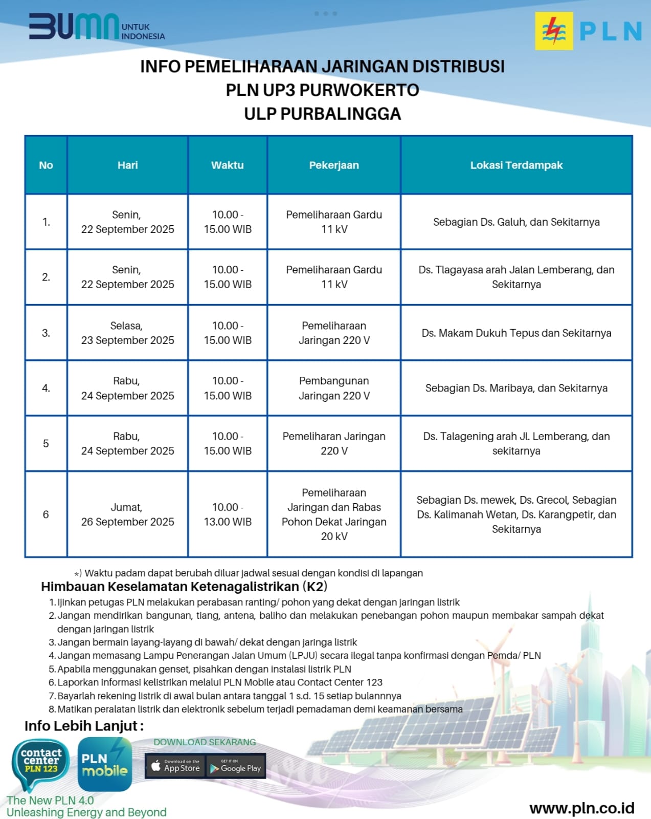 SERAYUNEWS– Perusahaan Listrik Negara Unit Layanan Pelanggan (PLN ULP) Kabupaten Purbalingga melaksanakan pemeliharaan dan pemadaman aliran listrik pada 15-18 September 2025. Pemadaman dilakukan untuk mendukung pekerjaan pemeliharaan jaringan dan perawatan infrastruktur kelistrikan.