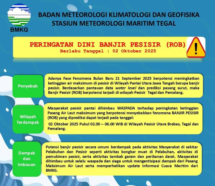 SERAYUNEWS-Badan Meteorologi Klimatologi dan Geofisika (BMKG) Stasiun Meteorologi Maritim Tegal menginformasikan beberapa wilayah di pantai utara Jawa akan mengalami rob pada Kamis 2 Oktober 2025.