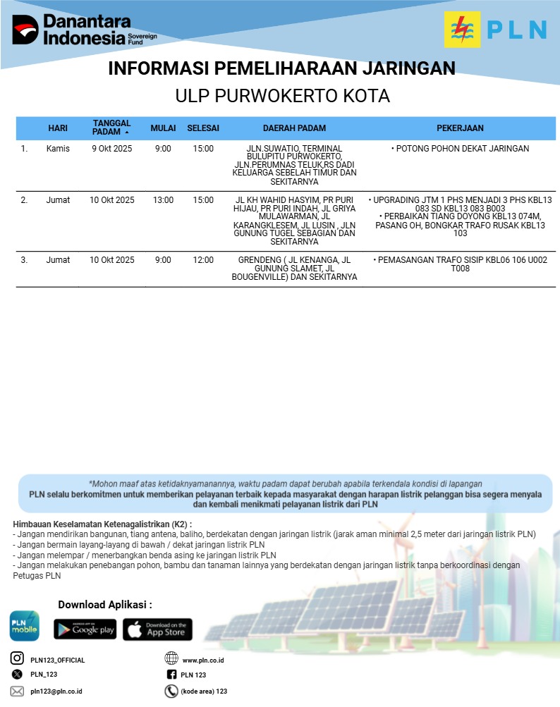 SERAYUNEWS – PLN Unit Layanan Pelanggan (ULP) Purwokerto Kota menjadwalkan pemeliharaan jaringan listrik di sejumlah titik selama sepekan, mulai Senin (6/10/2025) hingga Jumat (10/10/2025). Kegiatan ini dilakukan untuk menjaga keandalan pasokan listrik dan meningkatkan kualitas pelayanan kepada pelanggan.