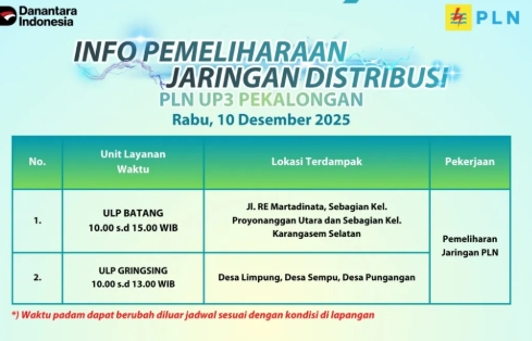 SERAYUNEWS-PLN UP3 Pekalongan melakukan pemadaman listrik di beberapa wilayah pada 10 Desember 2025. Warga terdampak diimbau melakukan antisipasi karena keberadaan listrik sangat penting di masa kini.