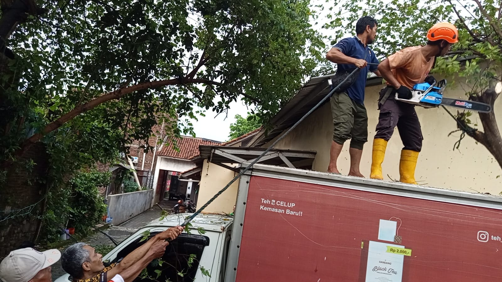 Jalan Perintis Gang Durian Raya, Karangwangkal, Grendeng, Purwokerto Utara – Pohon tumbang menutup sebagian jalan lingkungan.