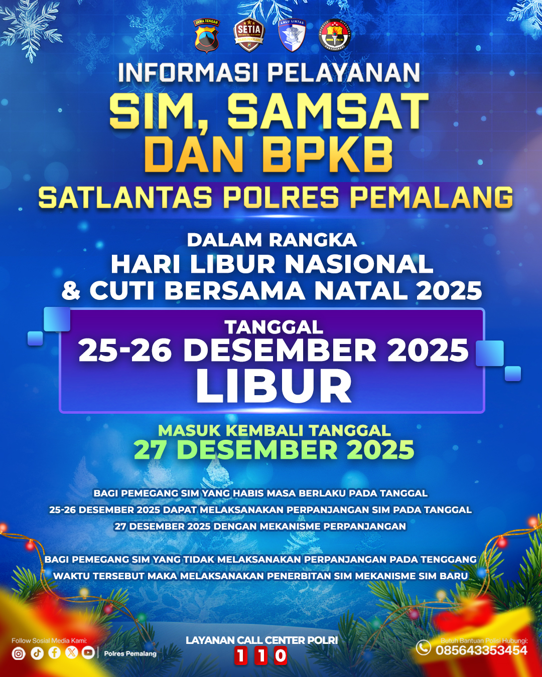 SERAYUNEWS-Polres Pemalang mengumumkan libur pelayanan surat izin mengemudi (SIM), Samsat, dan buku pemilik kendaraan bermotor (BPKB). Pelayanan tiga hal itu libur selama dua hari yakni pada 25 dan 26 Desember 2025.