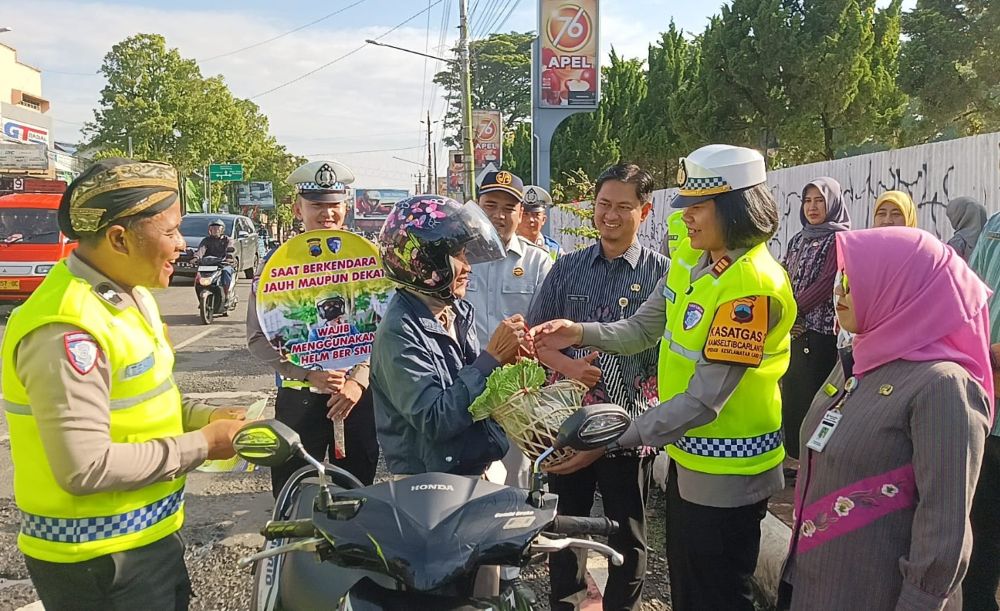 Kasat Lantas Polres Purbalingga, AKP Gharasa Zahra Zahirah, mengatakan pada hari kedua pelaksanaan Operasi keselamatan Candi 2026, kami menggelar aksi simpatik berupa pembagian helm dan sayuran bagi pengendara. “Helm dan sayuran dibagikan kepada pengguna jalan yang telah tertib berlalu lintas baik dari kelengkapan kendaraan maupun surat-suratnya,” katanya.