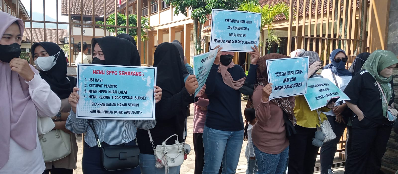 Dalam aksi tersebut, para orang tua membentangkan poster dan menutup akses masuk saat kendaraan pengantar MBG tiba di lingkungan sekolah. Mereka menuntut perbaikan kualitas dan keamanan pangan demi kesehatan anak-anak.