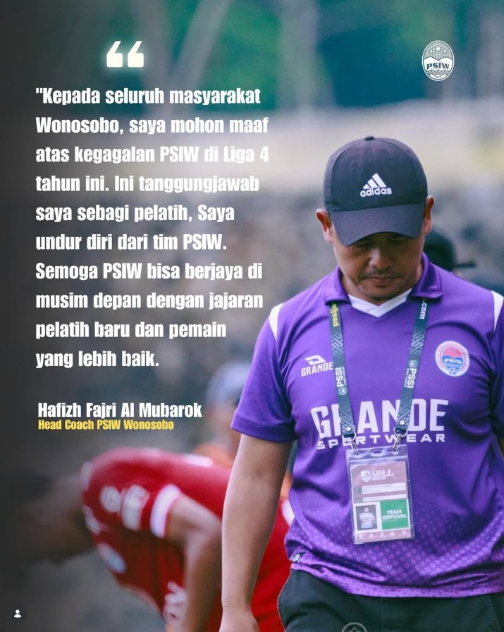 “Kepada seluruh masyarakat Wonosobo, saya mohon maaf atas kegagalan PSIW di Liga 4 tahun ini. Ini adalah tanggung jawab saya sebagai pelatih,” ujar Hafizh dalam pernyataan resminya.