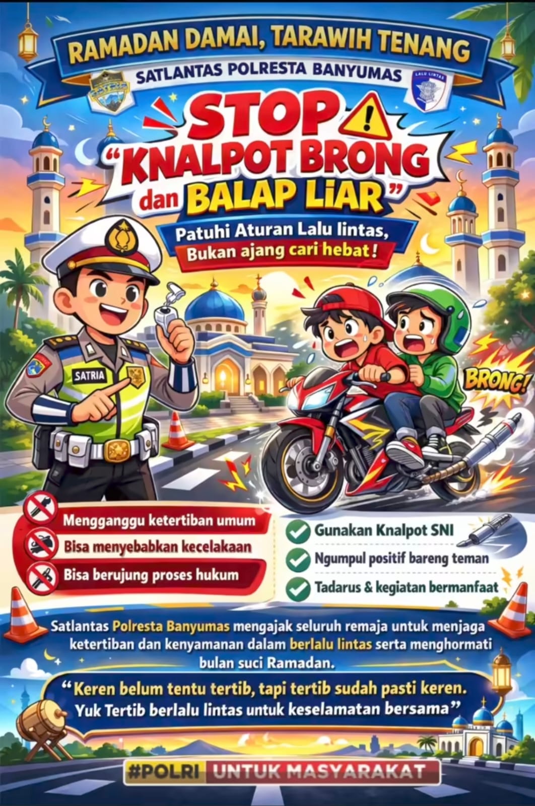 “Bulan suci Ramadan adalah momen untuk memperbanyak ibadah, menjaga ketenangan, dan saling menghormati. Jangan sampai suara knalpot brong dan aksi balap liar mengganggu kekhusyukan masyarakat dalam menjalankan ibadah,” demikian pesan dalam unggahan tersebut.