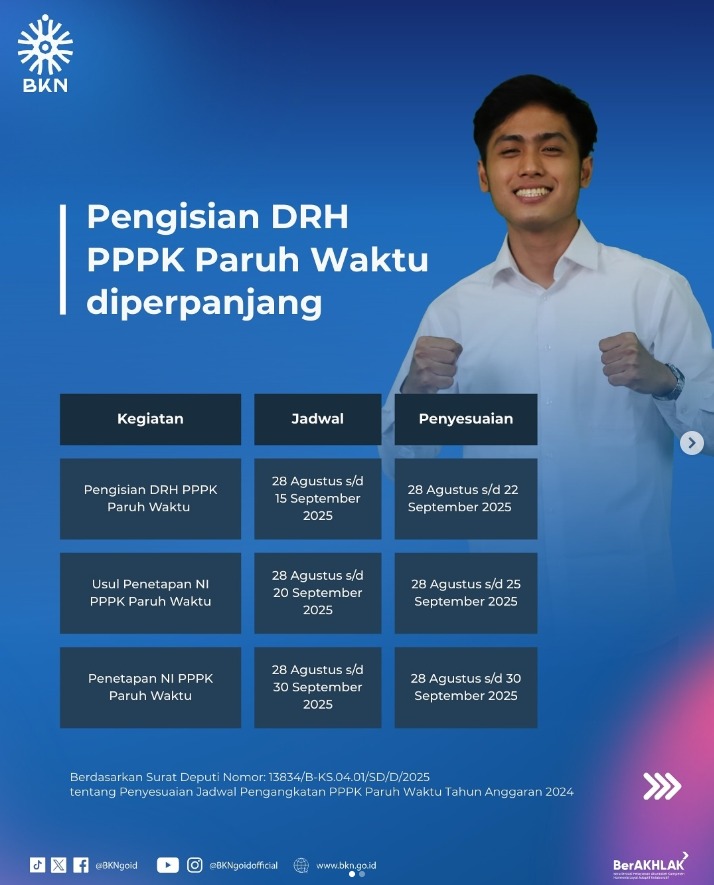 Perpanjangan ini disampaikan melalui Surat Deputi Nomor 13834/B-KS.04.01/SD/D/2025 tentang Penyesuaian Jadwal Pengangkatan PPPK Paruh Waktu Tahun Anggaran 2024.