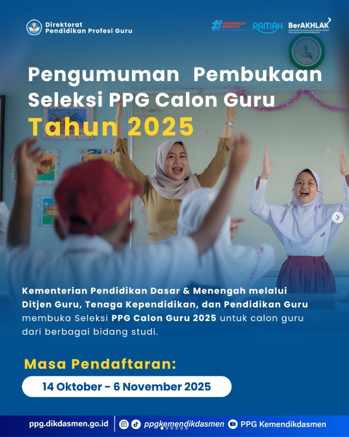 Seluruh informasi resmi terkait jadwal, persyaratan, dan teknis seleksi PPG 2025 dapat diakses melalui laman resmi Direktorat PPG: https://ppg.kemendikdasmen.go.id