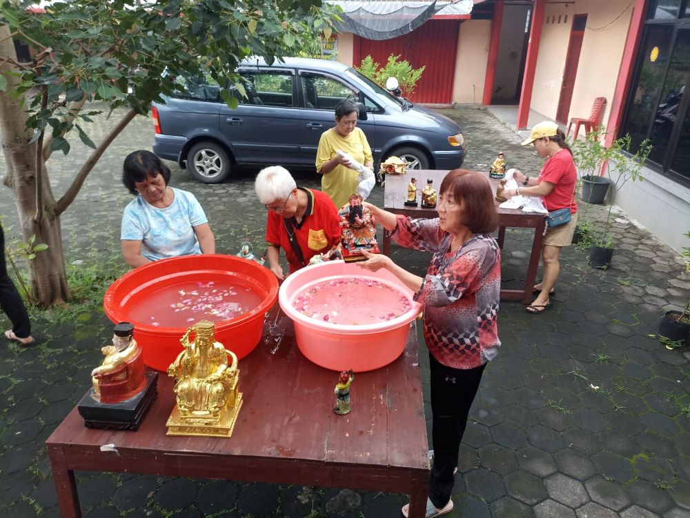 Umat membersihkan area klenteng beserta lingkungan sekitar. Fokus utama kegiatan tersebut adalah membersihkan patung-patung dewa dan dewi yang berada di Klenteng Hok Tek Bio Purbalingga.