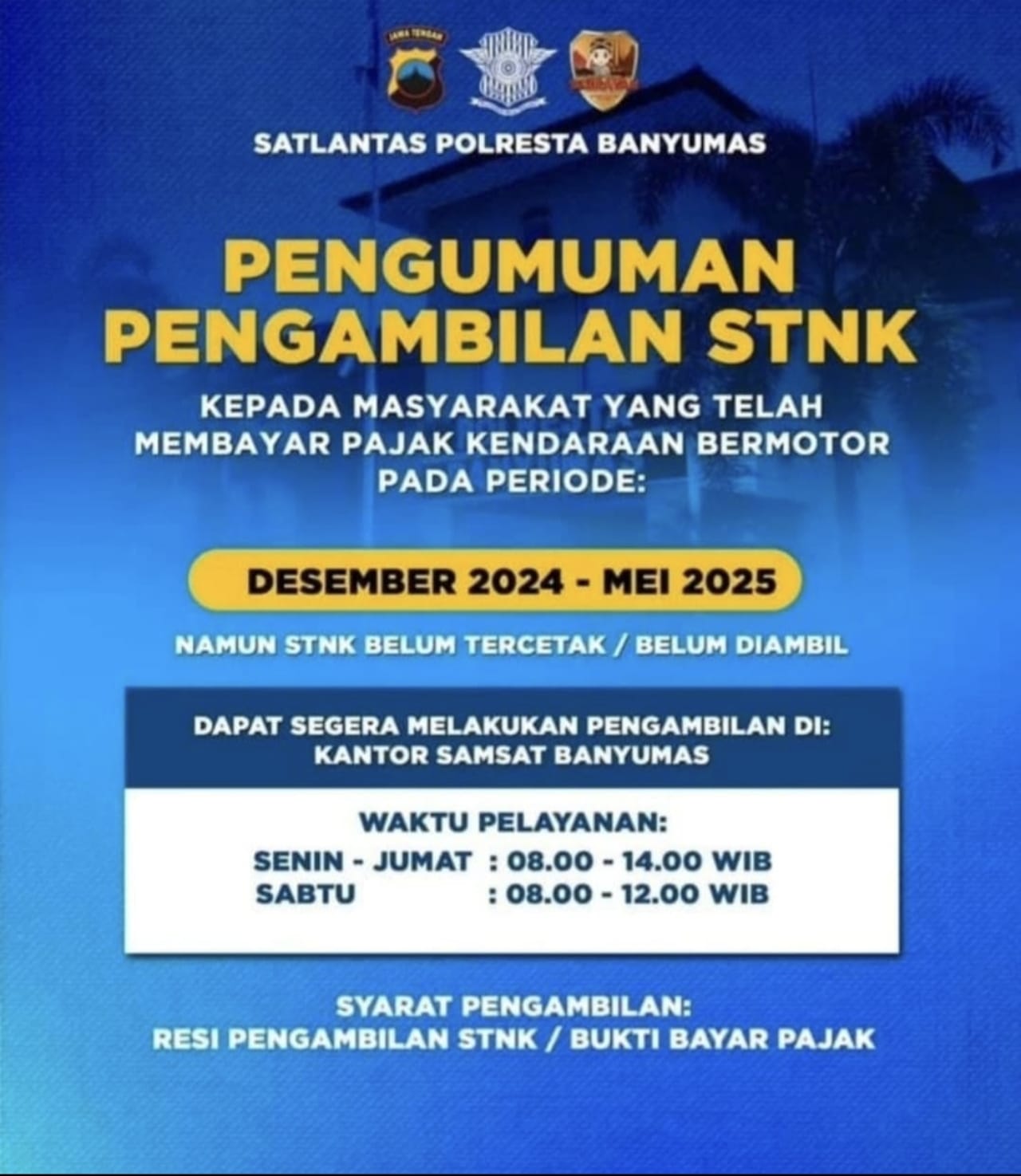 SERAYUNEWS – Satuan Lalu Lintas (Satlantas) Polresta Banyumas memberikan pengumuman penting bagi masyarakat. Satlatas Polresta Banyumas mengumumkan kepada masyarakat yang telah membayar pajak kendaraan bermotor pada periode Desember 2024 hingga Mei 2025. Pengumuman ini adalah untuk mereka yang STNK-nya belum tercetak atau belum diambil. Sehingga diminta untuk segera melakukan pengambilan di Kantor Samsat Banyumas.