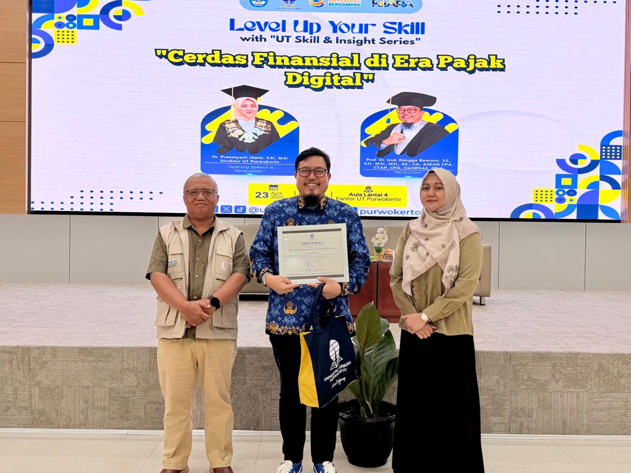 SERAYUNEWS – Universitas Terbuka (UT) Purwokerto menggelar seminar bertajuk “Cerdas Finansial di Era Pajak Digital” pada 23 April 2026 di Aula Lantai 4 Kantor UT Purwokerto. Kegiatan ini menghadirkan Prof. Dr. Icuk Rangga Bawono sebagai narasumber utama dan dibuka langsung oleh Direktur UT Purwokerto, Dr. Prasetyarti Utami, S.Si., M.Si. Seminar ini menyasar mahasiswa serta masyarakat umum dengan tujuan meningkatkan pemahaman pengelolaan keuangan sekaligus kesiapan menghadapi perkembangan teknologi dan regulasi perpajakan digital.