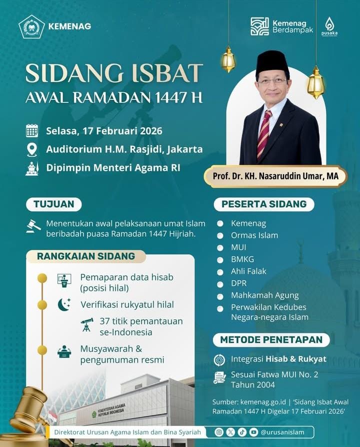 Kementerian Agama Republik Indonesia (Kemenag) memastikan sidang akan digelar pada Selasa, 17 Februari 2026, sebagai forum resmi penentuan awal puasa Ramadhan 2026 bagi umat Islam di Indonesia.