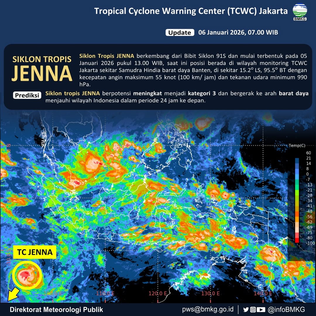 SERAYUNEWS- Badan Meteorologi, Klimatologi, dan Geofisika (BMKG) mengonfirmasi terbentuknya Siklon Tropis Jenna yang berasal dari Bibit Siklon 91S.