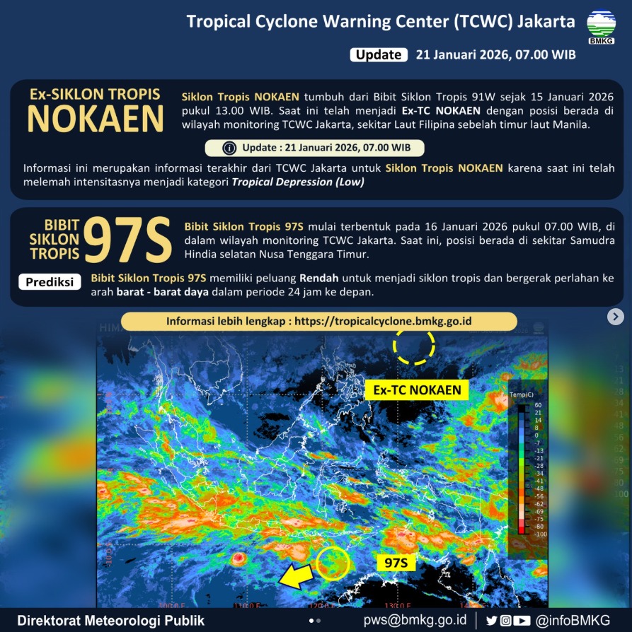 Selain NOKAEN, BMKG juga terus memantau Bibit Siklon Tropis 97S yang saat ini berada di Samudra Hindia selatan Nusa Tenggara Timur (NTT). Bibit siklon ini teridentifikasi sejak 16 Januari 2026 dan masih berada dalam wilayah pemantauan TCWC Jakarta.
