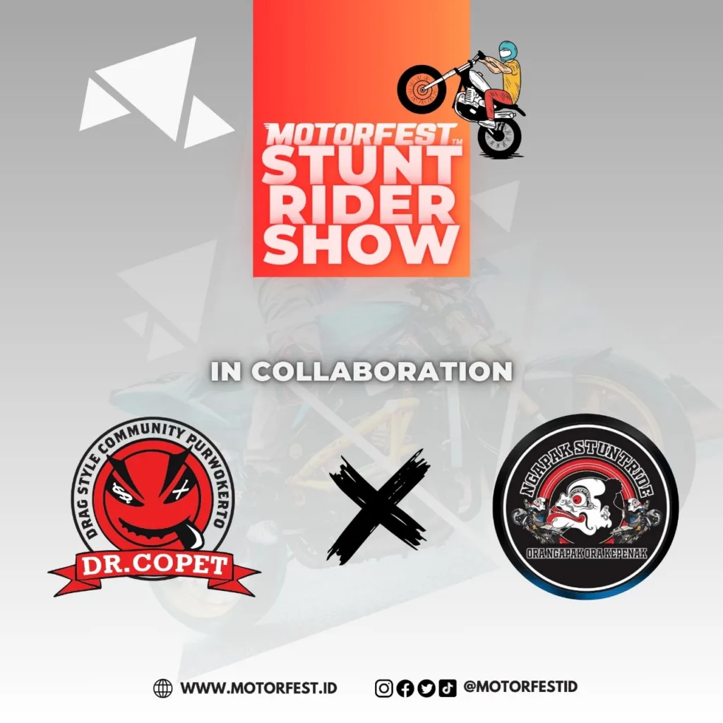 Stunt Rider Show di Motorfest 2023 ini, berkolaborasi dengan DR Copet dan Ngapak Stunt Rider. Keduanya merupakan komunitas freestyle roda dua yang melegenda, di wilayah Banyumas dan sekitarnya.