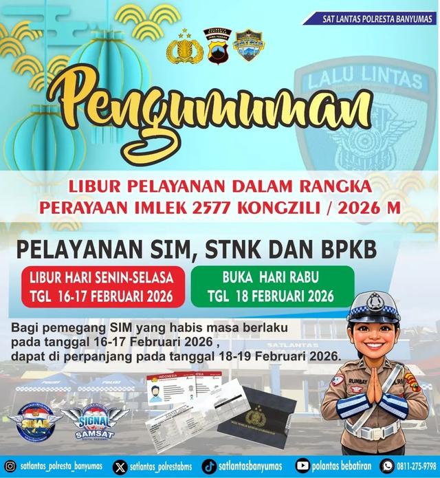 Pelayanan SIM, STNK, BPKB di Banyumas Libur 2 Hari, Buka 18 Februari 2026