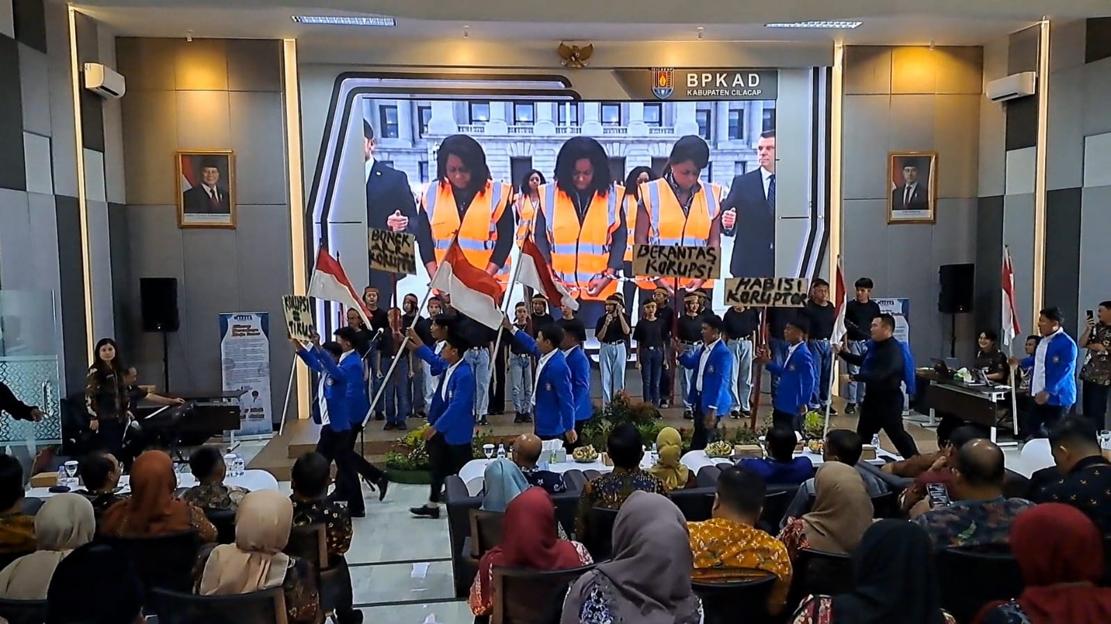 SERAYUNEWS – Ada yang berbeda dalam pelaksanaan Gelar Pengawasan Daerah (Larwasda) 2025 di Kabupaten Cilacap. Di tengah forum resmi yang biasanya diisi laporan dan evaluasi, suasana Aula BPKAD Cilacap mendadak bergemuruh oleh penampilan teatrikal musikal bertema “Anti Korupsi” yang dibawakan para pelajar.
