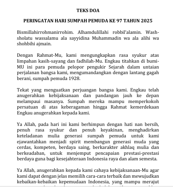 Berikut teks lengkap Doa Peringatan Hari Sumpah Pemuda ke-97 Tahun 2025.