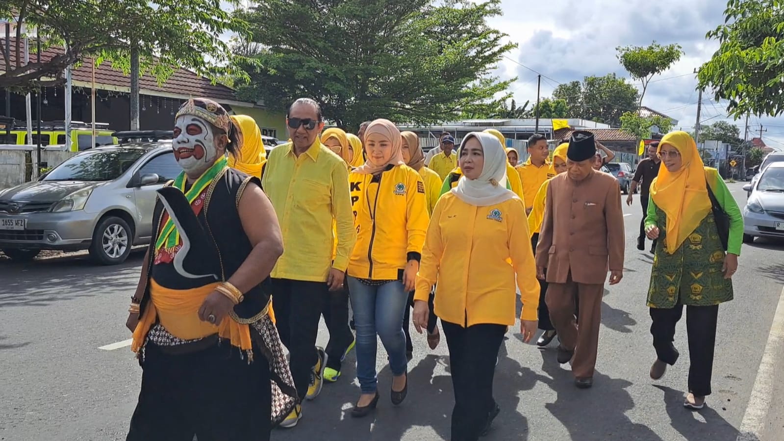 Rombongan juga dikawal tokoh semar, lalu disambut panitia Musda sebelum Teti menyerahkan berkas pendaftaran.