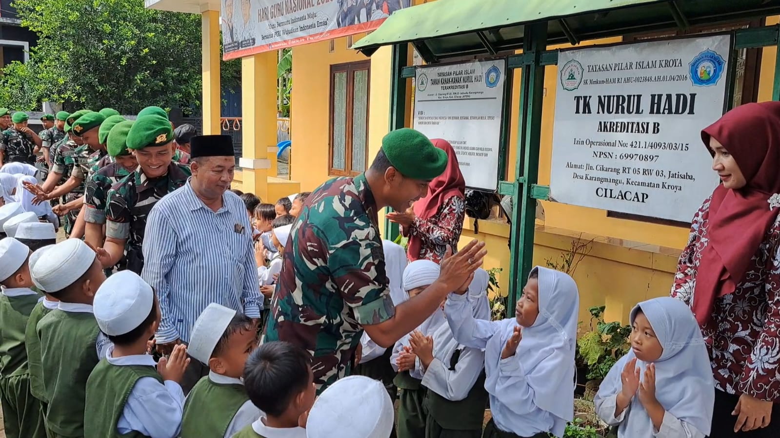 Sejak pagi, suasana halaman TK Nurul Hadi tampak berbeda. Anak-anak terlihat antusias menyambut kedatangan para prajurit TNI yang hadir lengkap dengan atribut dinas. Alih-alih merasa takut, para siswa justru tampak akrab. Mereka bercengkerama, bernyanyi, hingga makan bersama yang bahkan disuapi langsung oleh anggota TNI.