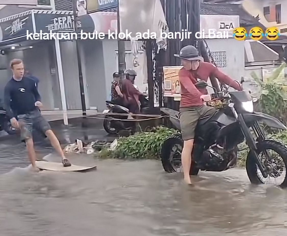 Alih-alih takut atau panik, beberapa bule justru memunculkan ide unik. Mereka menyewa papan surfing dan mencoba berselancar di jalanan aspal yang tergenang air.