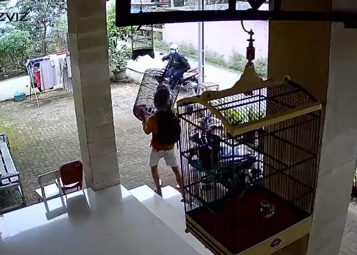 Rekannya yang mengenakan jaket dan celana biru tetap siaga di atas motor. Setelah burung berhasil digasak, keduanya langsung kabur dengan kecepatan tinggi.