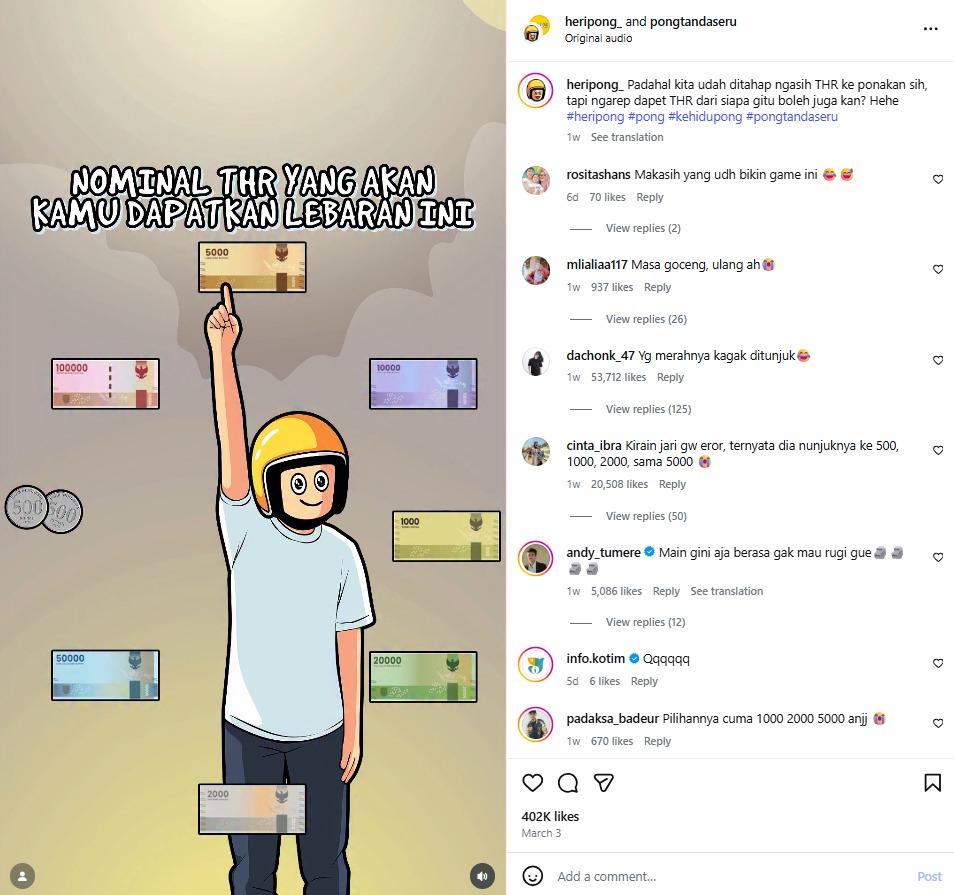 “Padahal kita udah ditahap ngasih THR ke ponakan sih, tapi ngarep dapet THR dari siapa gitu boleh juga kan? Hehe.” Unggahan tersebut kemudian viral dan memicu ribuan komentar dari warganet yang ikut mencoba permainan tersebut.