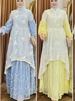 Modelnya umumnya berupa dress panjang dengan siluet lurus yang jatuh mengikuti bentuk tubuh tanpa terlihat ketat.