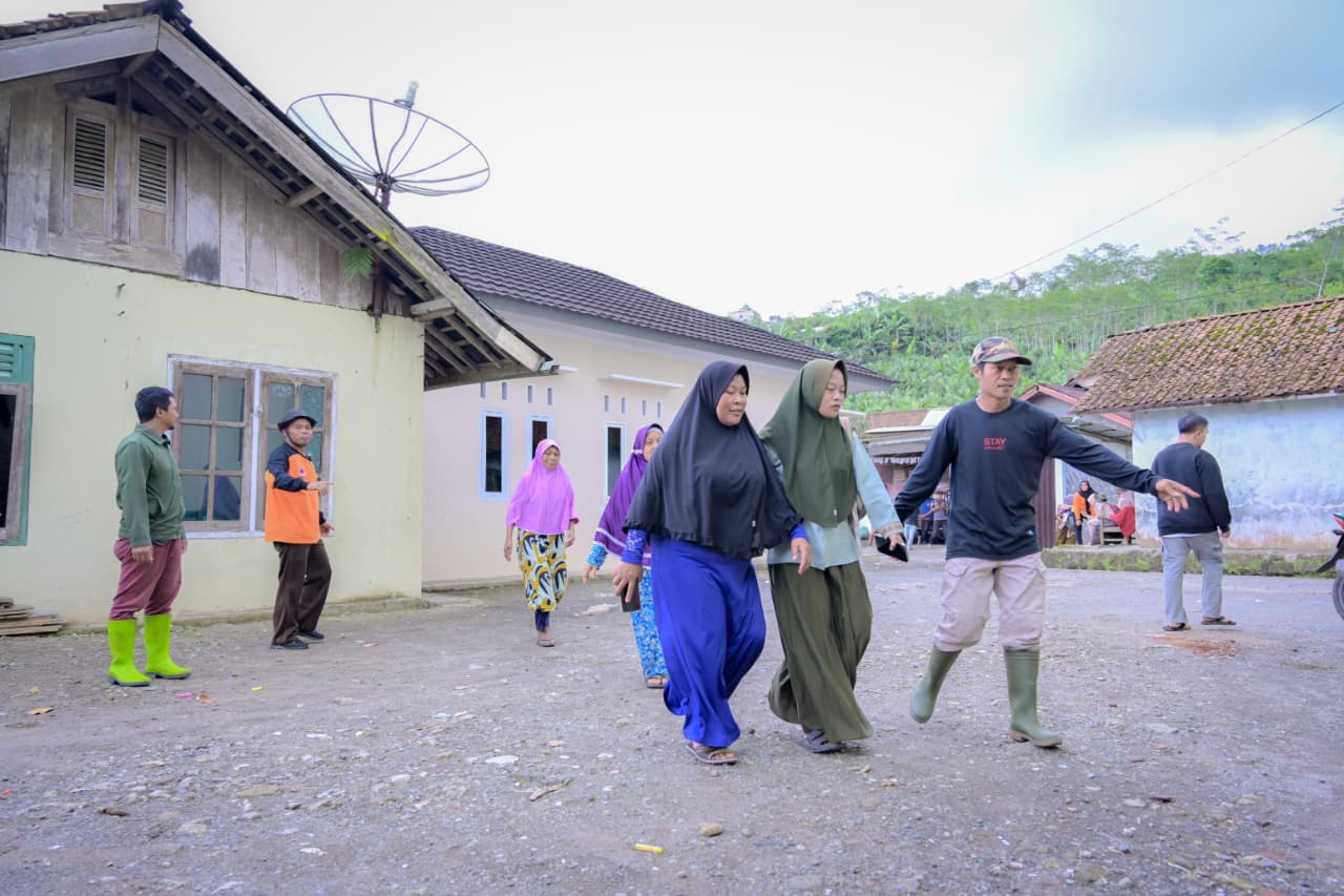 Dalam simulasi, warga merespons bunyi sirene dari Early Warning System (EWS) sebagai tanda peringatan potensi bencana tanah longsor.