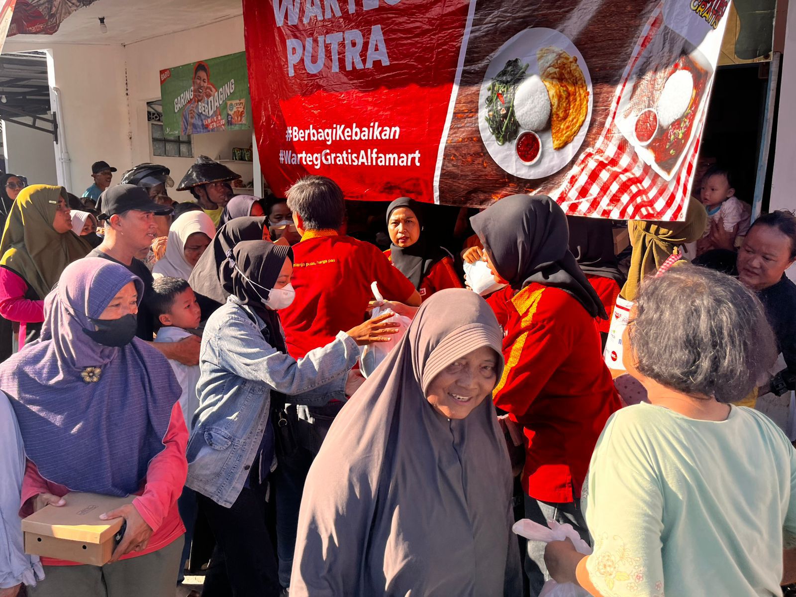 Program berbagi tersebut merupakan bagian dari kegiatan Warteg Gratis 2026 yang digelar oleh Alfamart selama bulan Ramadan. Setiap sore, masyarakat berdatangan lebih awal untuk mendapatkan paket makanan berbuka yang dibagikan dari warung tersebut.