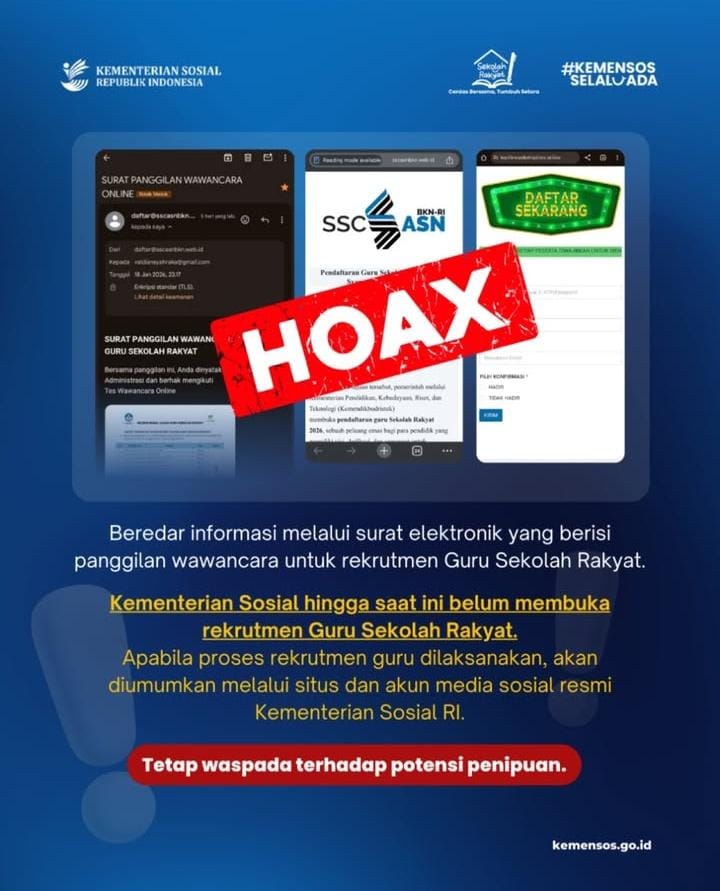 SERAYUNEWS- Kementerian Sosial Republik Indonesia (Kemensos RI) kembali mengingatkan masyarakat untuk waspada terhadap hoaks yang mengatasnamakan rekrutmen Guru Sekolah Rakyat (SR).